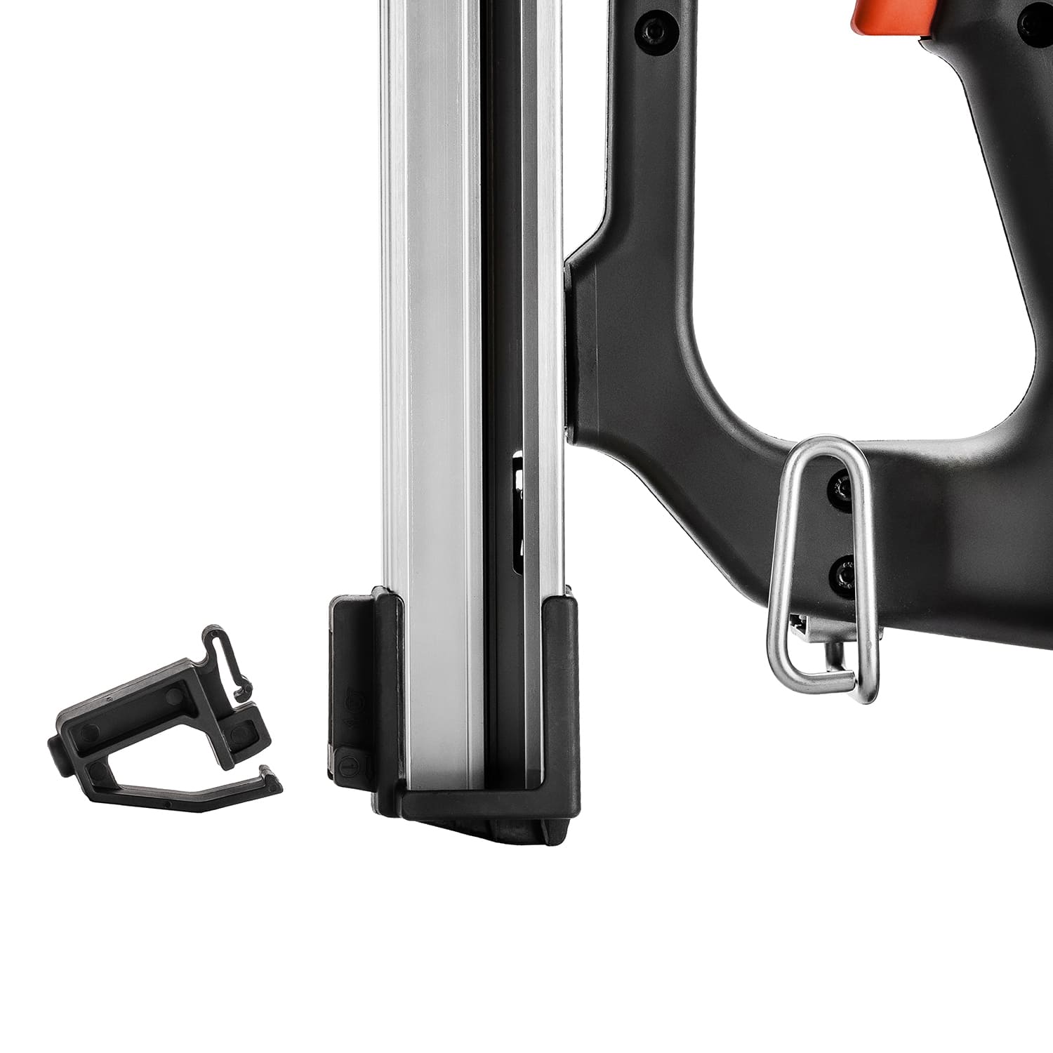 Быстросъемный магазин с упрощенной системой загрузки гвоздей - это упрощает работу с инструментом в плотных перчатках, на высоте или одной рукой, когда надо придерживать материал пристрелки.